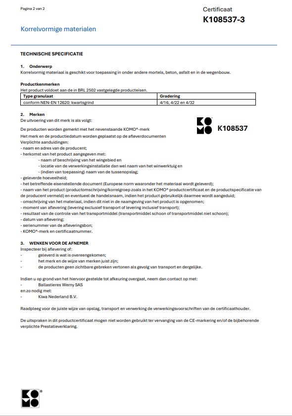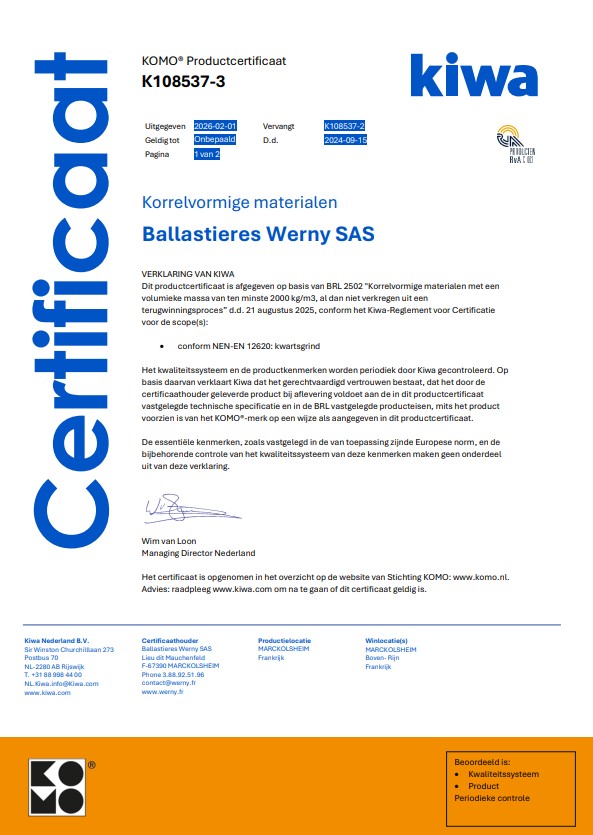 Anfang 2022 wurde am BALLASTIERES WERNY in Marckolsheim die KOMO-Zertifizierung für gerollte Materialien für Kunden in Holland eingeführt.